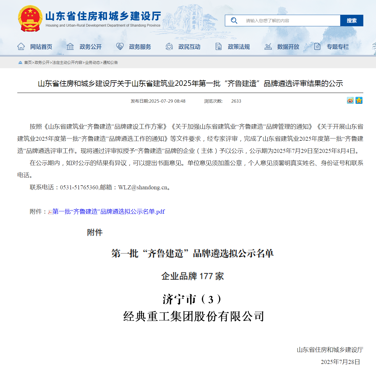 近日,山東省住房和城鄉(xiāng)建設廳正式公布2025年第一批“齊魯建造”品牌遴選名單,經(jīng)典重工集團股份有限公司憑借在鋼結(jié)構建筑部品建材領域的技術實力與品牌影響力,成功入選部品建材品牌名錄,這標志著公司在推動建筑產(chǎn)業(yè)現(xiàn)代化、智能化、綠色化發(fā)展方面的綜合實力又獲省級權威認可。2025-08-06